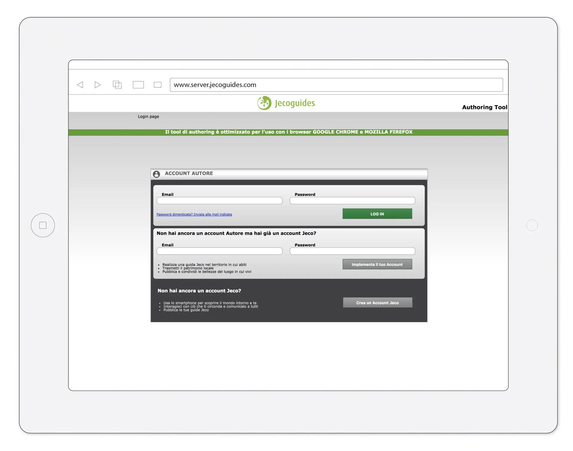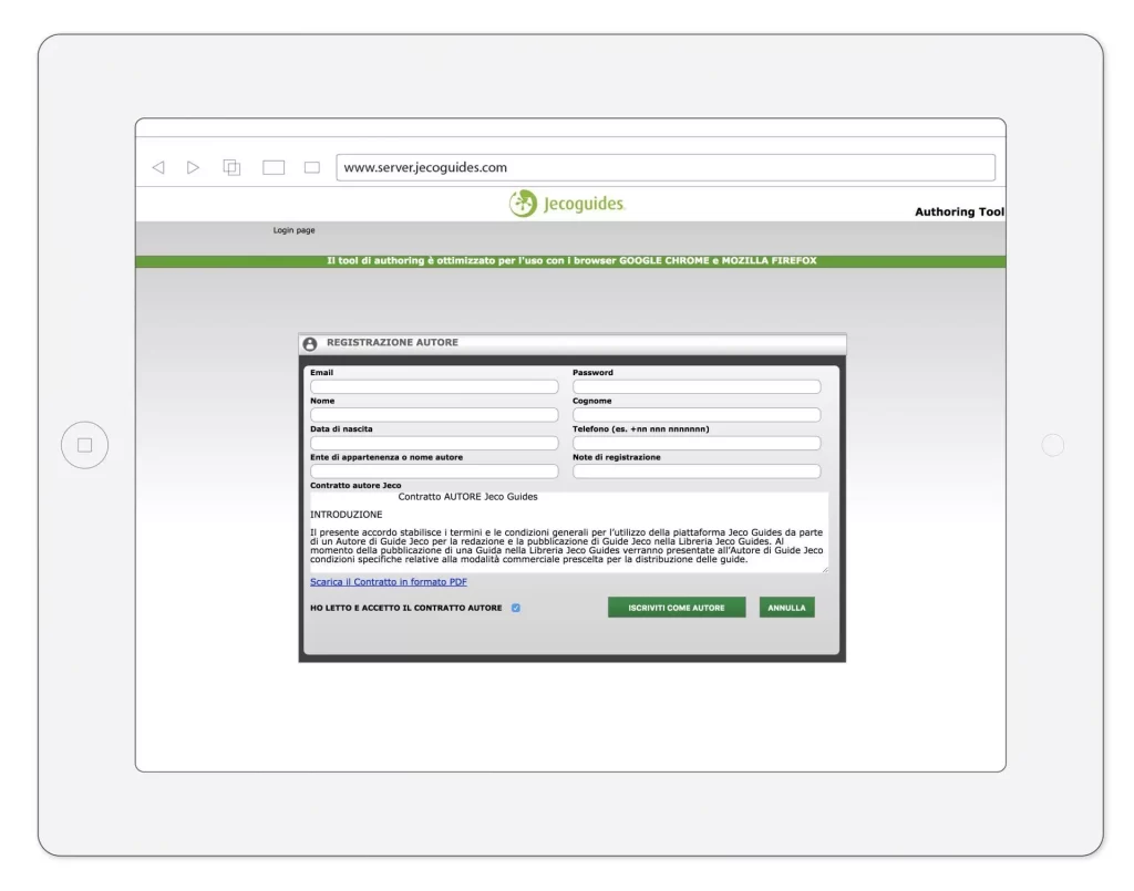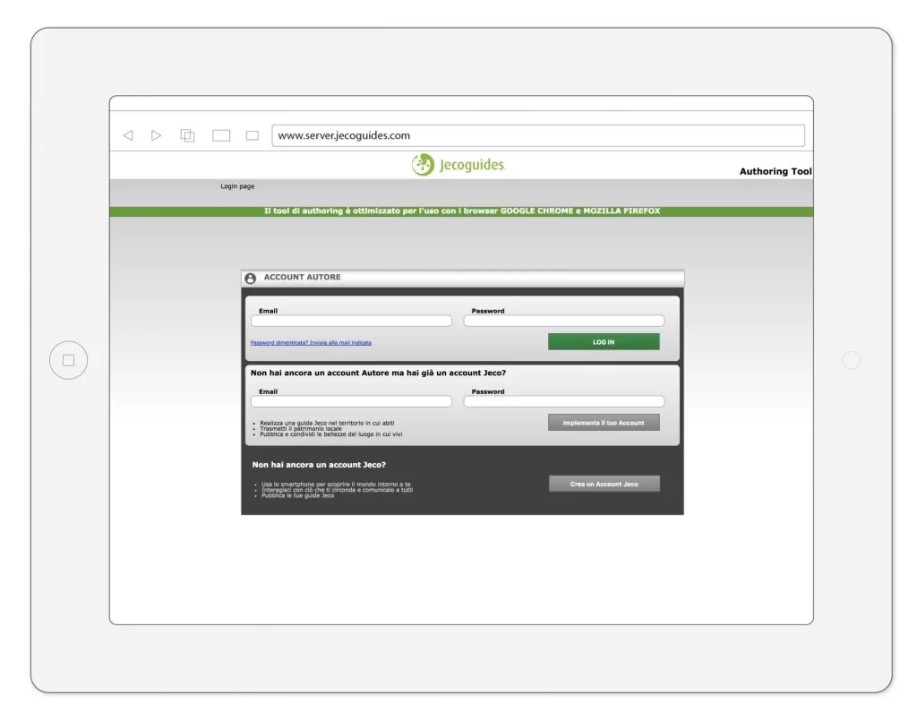 ❉ Se sei già un Autore di Jecoguides, accedi al Tool di authoring inserendo le tue credenziali e vai direttamente allo STEP 2