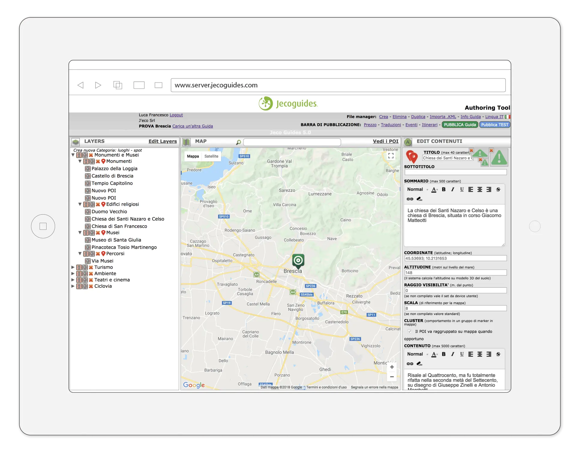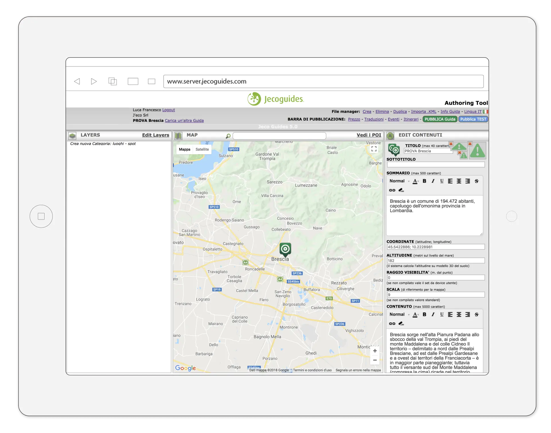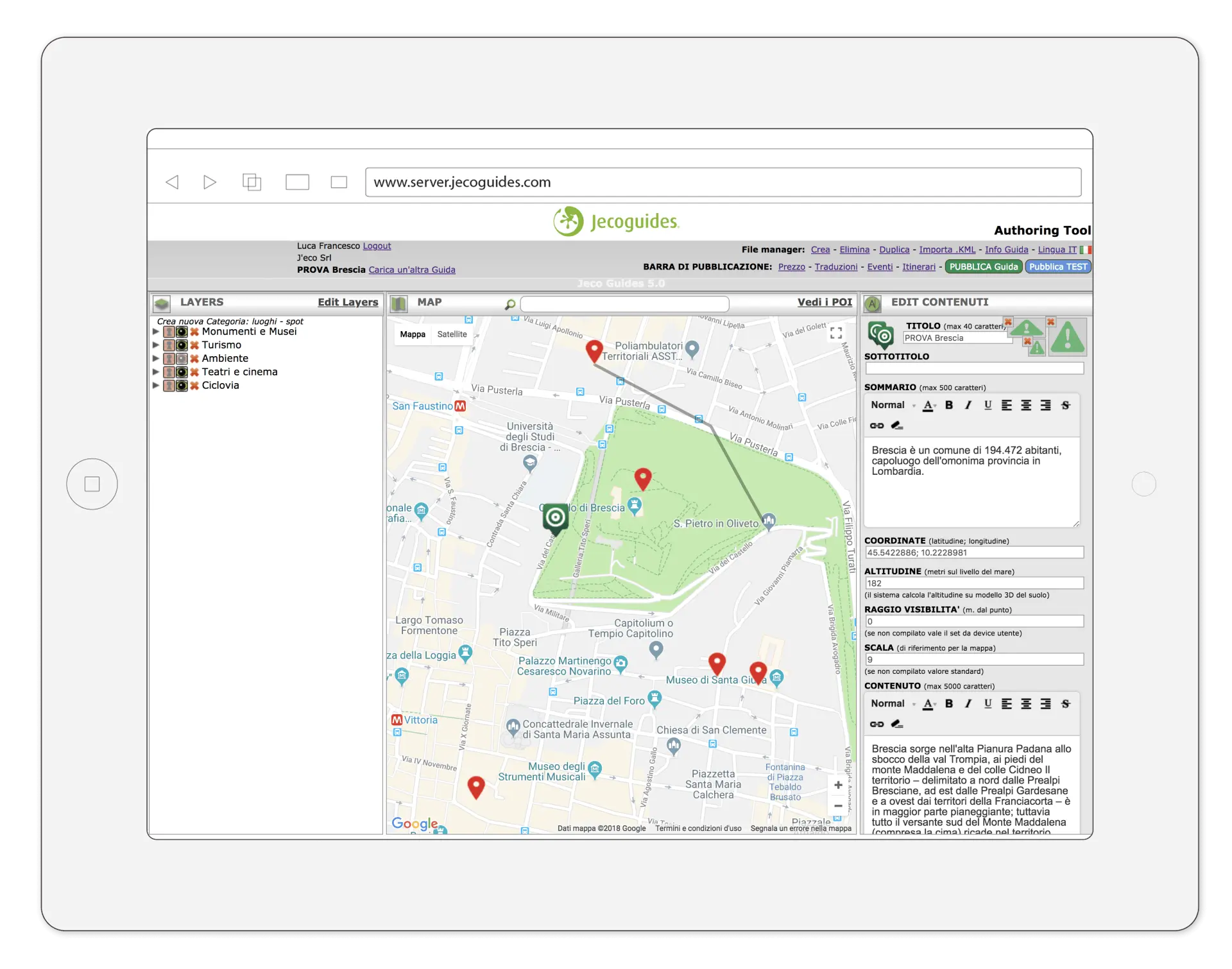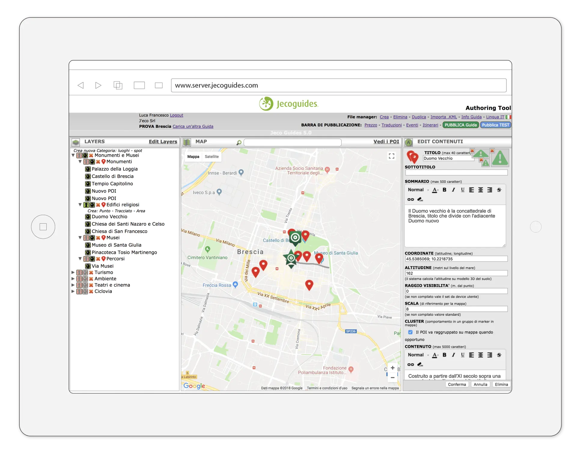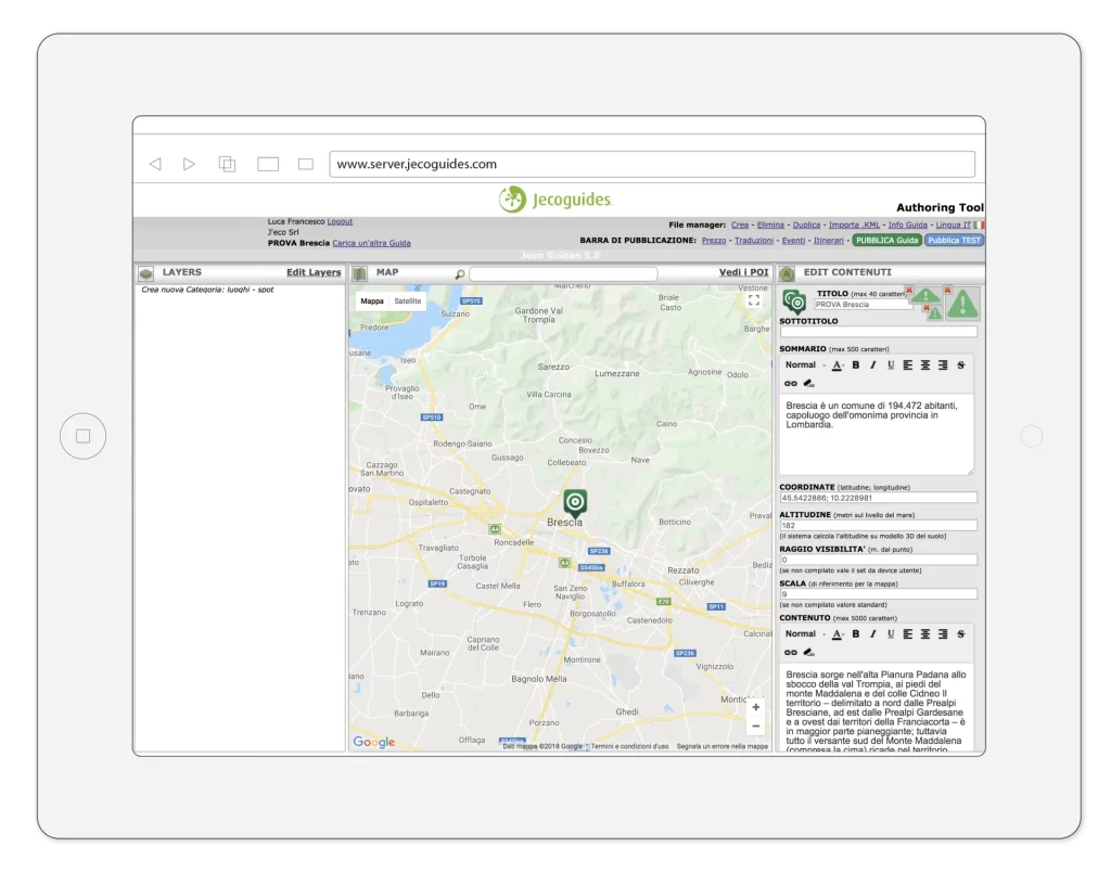 Se vuoi provare la tua nuova App prima di pubblicarla agli Utenti clicca “Pubblica Test”. Ora puoi testare in tempo reale la tua nuova Guida nella sezione “Authoring” dell’App Jecoguides, disponibile per iPhone e Android, registrata con il tuo Account.