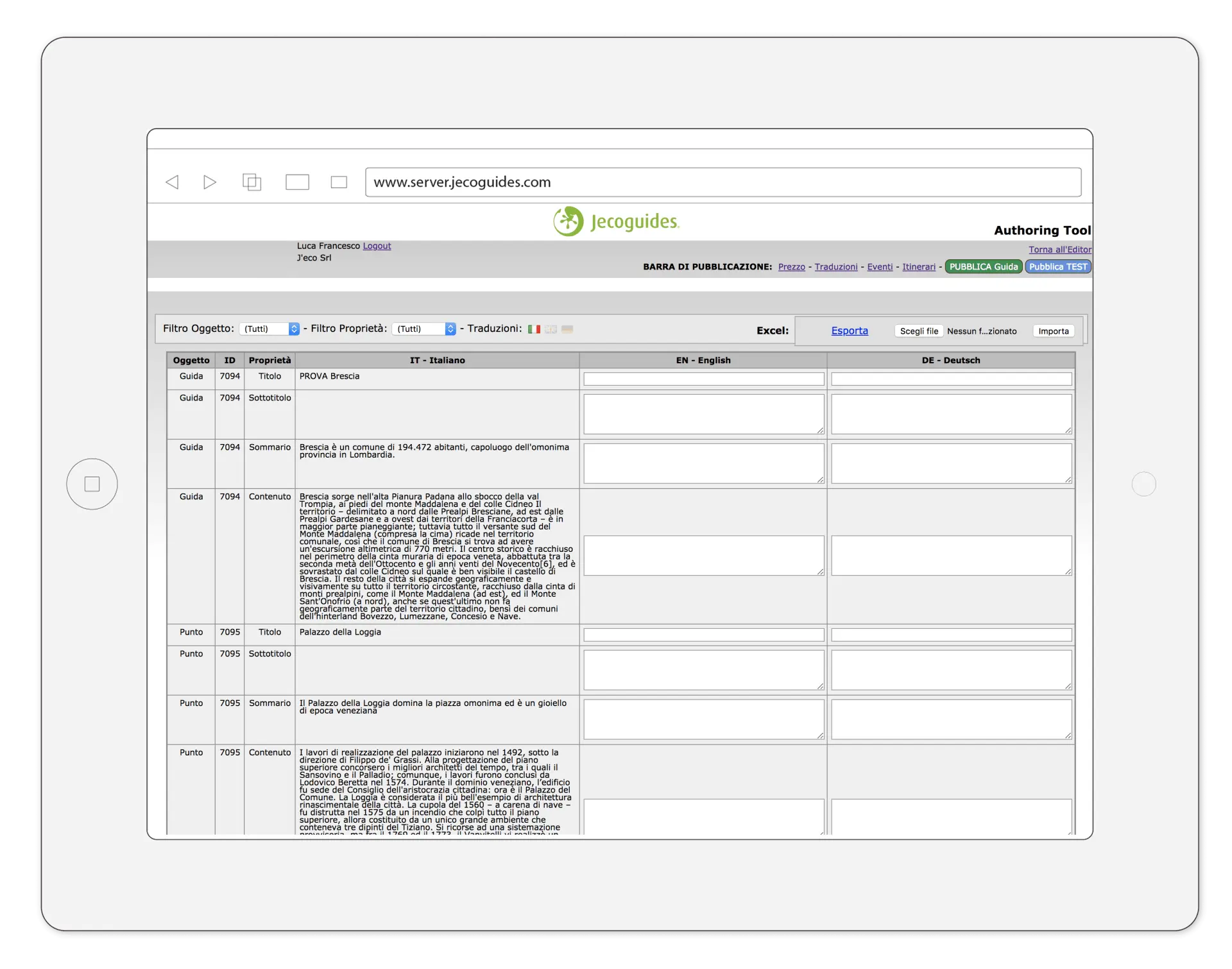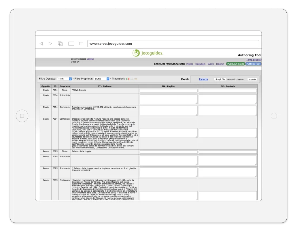 Clicca su “Esporta” in altro a destra, per scaricare il database dove caricare le traduzioni corrispondenti a ogni elemento. Una volta compilato, ricarica il file e clicca su “Importa”.